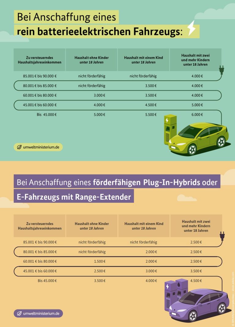 Jeder neue Kauf eines Elektroautos unter dieser Einkommensgrenze wird mit mindestens 3.000 Euro gefördert, jeder Kauf eines Autos mit Plug-in-Hybrid-Antrieb oder Range-Extender – sofern er bestimmte CO2-Anforderungen erfüllt – mit 1.500 Euro.