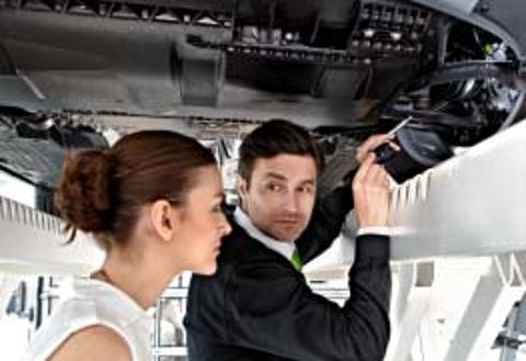 Nutzen Sie die kostenlose ŠKODA Dialogannahme und lassen Sie sich den Zustand Ihres Fahrzeugs von Ihrem Serviceberater direkt in der Werkstatt an der Hebebühne erklären.